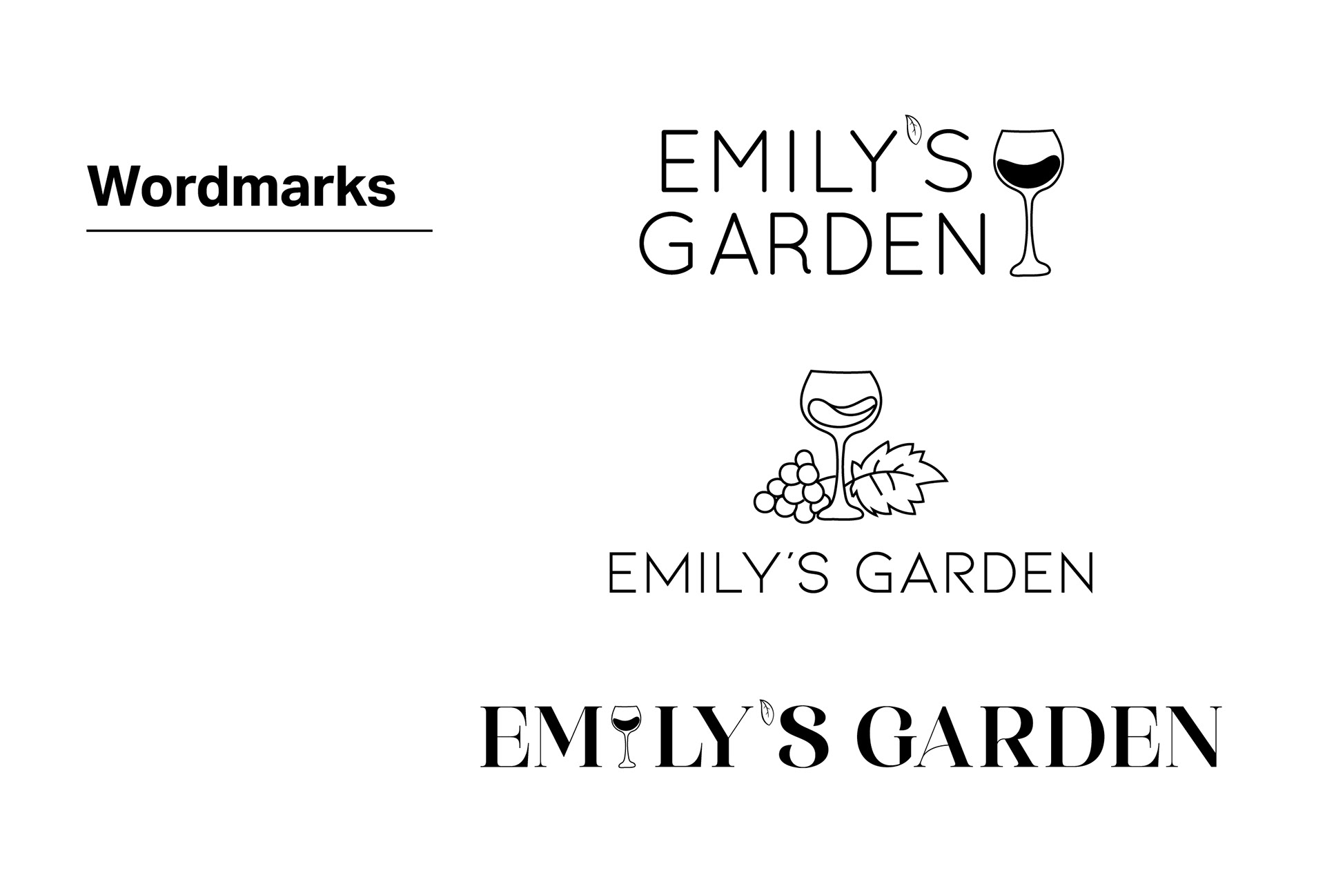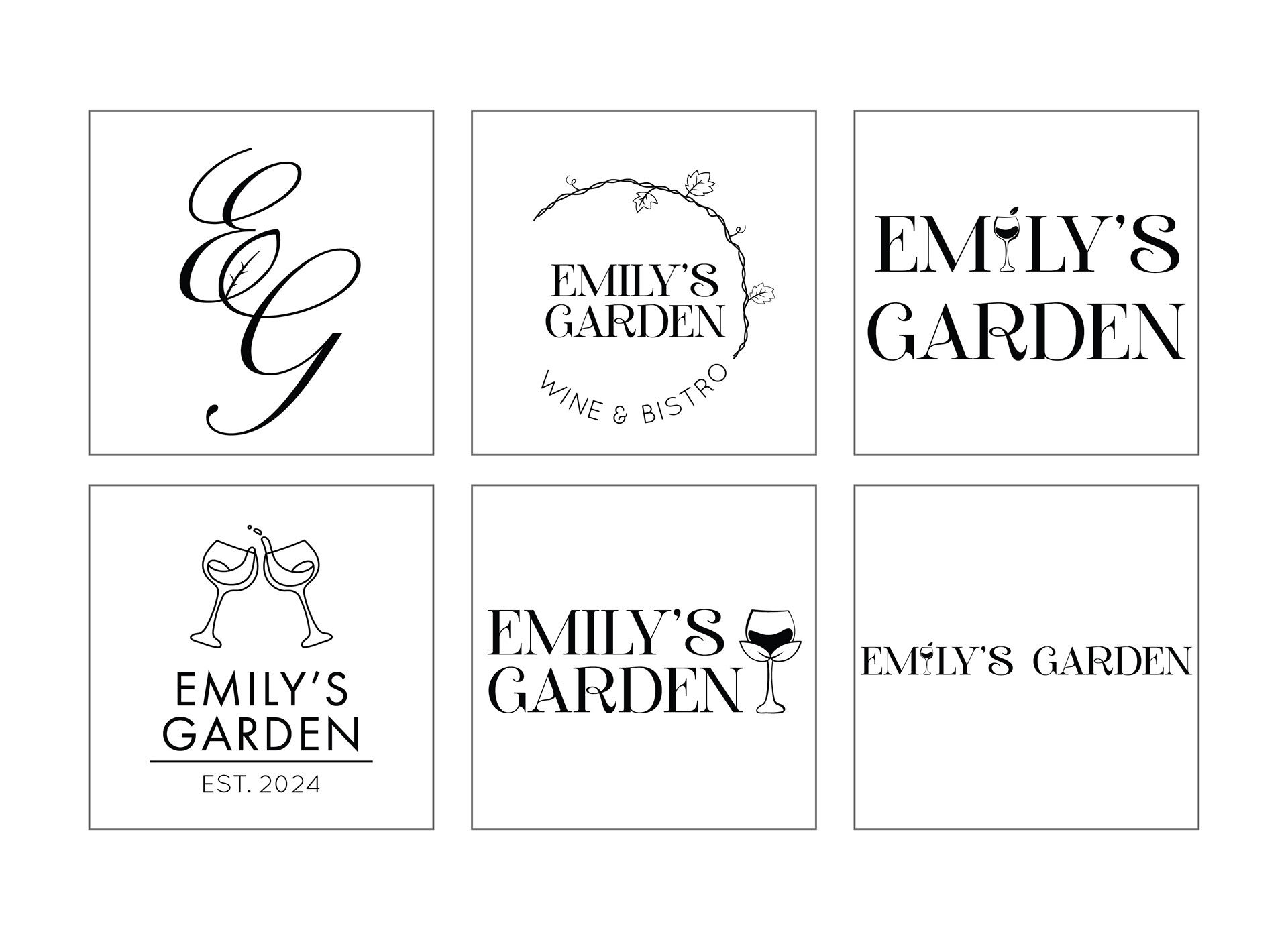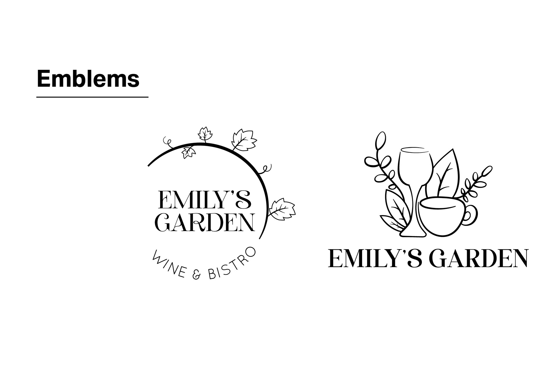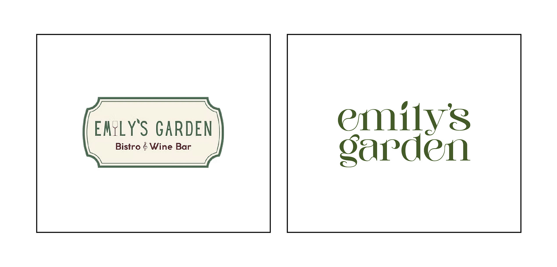 The final Emily’s Garden logo reflects the restaurant’s outdoor, modern garden vibe while capturing a playful and inviting character. Curvy serif lettering with customized “e’s” evokes botanical forms and adds personality. A subtle leaf motif, taken from the original logo, becomes the tittle of the “i” in “Emily’s,” connecting the new design to the brand’s heritage. This logo is then incorporated into the brand guidelines, creating a cohesive visual identity with clear rules for color, typography, and usage across all applications.