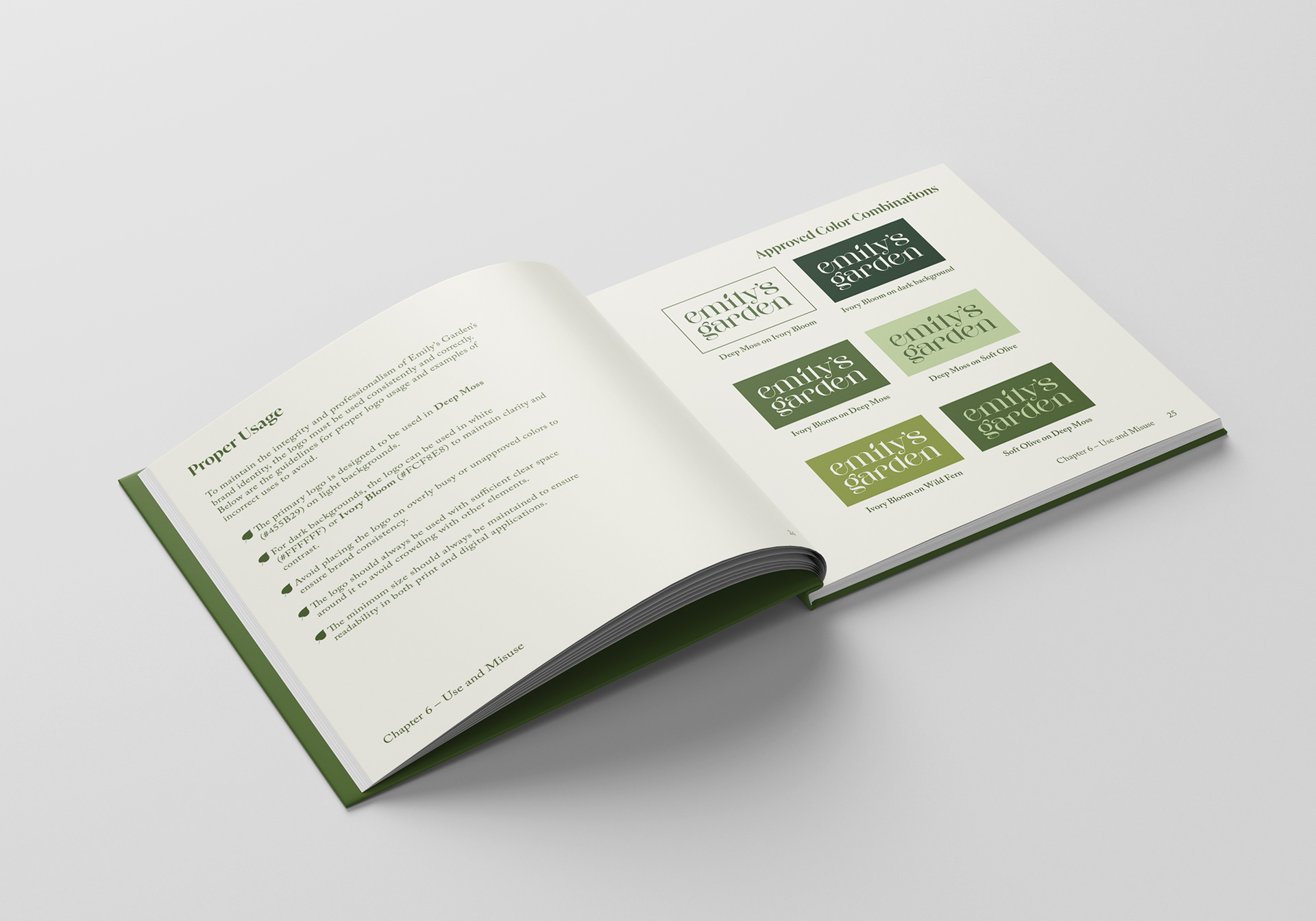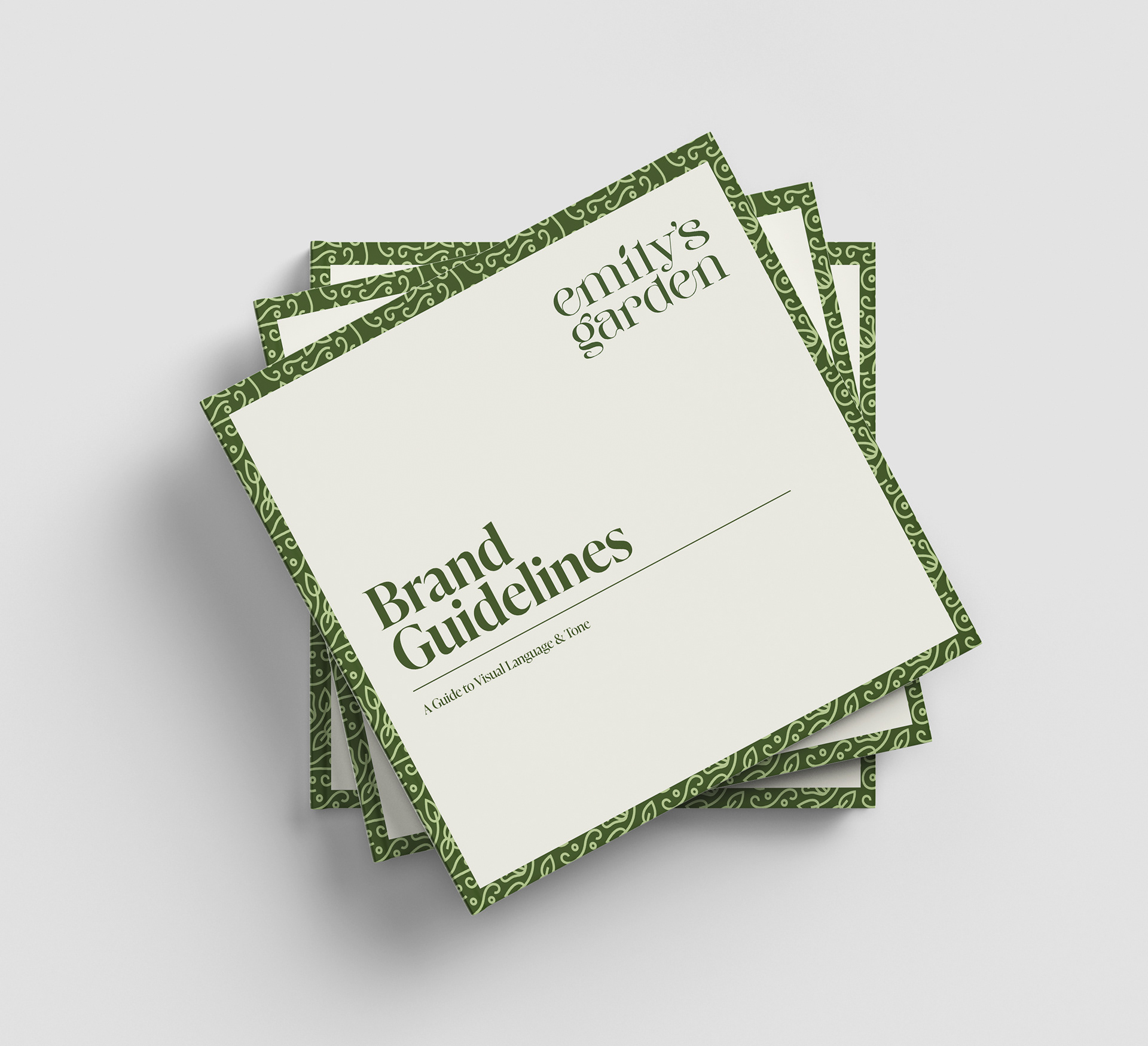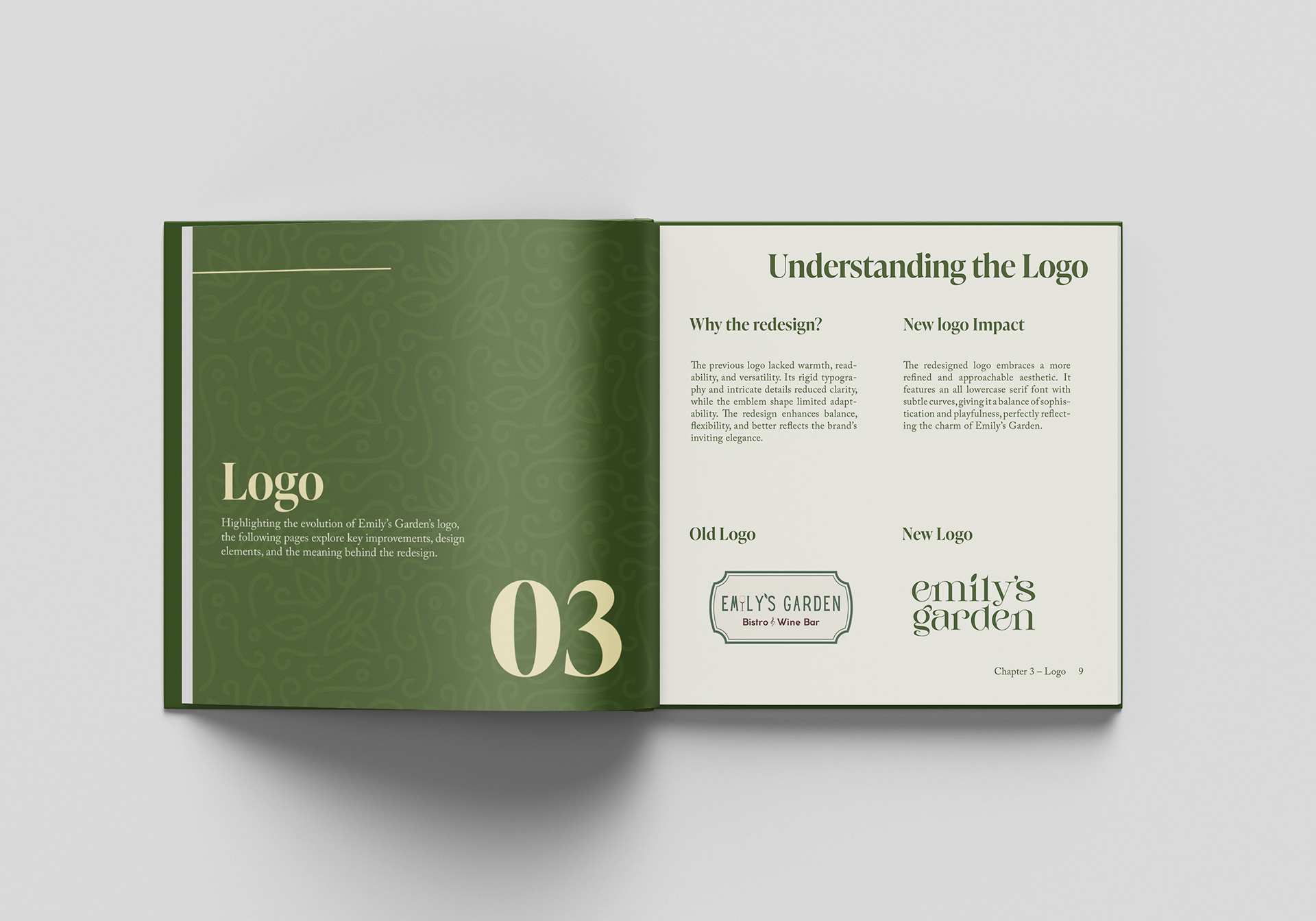This brand identity book establishes the visual system for Emily’s Garden, a local outdoor café. The book defines the standards for logo usage, typography, color palette, and supporting graphic elements